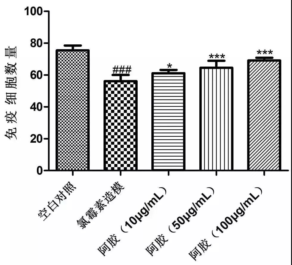 (斑马鱼免疫细胞数量统计) 研究表明,阿胶对氯霉素诱导的斑马鱼的免疫细胞减少有逆转作用,可以提高免疫细胞的数目,再结合上图可得出:阿胶可以达到提高免疫力的作用!