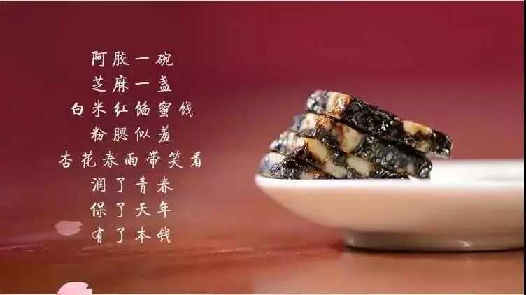 “阿胶一碗,芝麻一盏白米红馅蜜饯,粉腮羞,杏花春雨带笑看,润了青春,保了天年,有了本钱。”道明了阿胶美容养颜的特殊功效,阿胶糕—还你最古老最健康的内调养生之道!