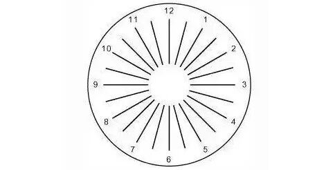 不戴眼镜看散光表,如果所有线条都粗细均匀,证明眼睛无散光现象。如果某一线条黑而清晰,其他线条模糊,则有散光的可能。