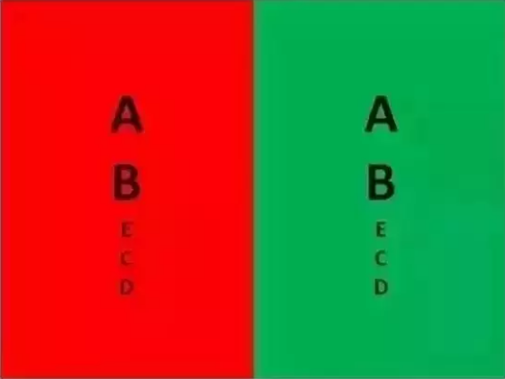 遮住一只眼看下图,正常人看到的红绿背景上的字母一样黑。如果红色字清楚,则是出现近视;如果绿底字清楚,则是出现远视。