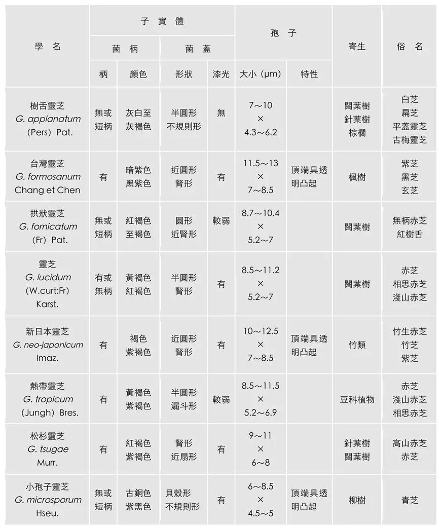 表(二)台湾地区常见的野生灵芝种类及其特性