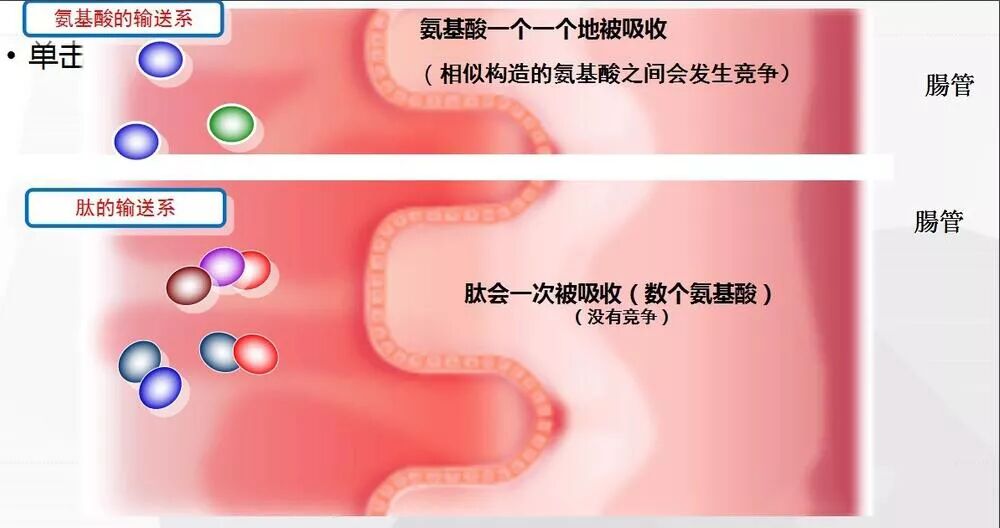 在人体中,吸收氨基酸的时候是一个一个被吸收的,而且相同构造的氨基酸之间还存在竞争关系,而在吸收肽的时候是数个被一起吸收,并且相同的肽之间没有竞争关系。