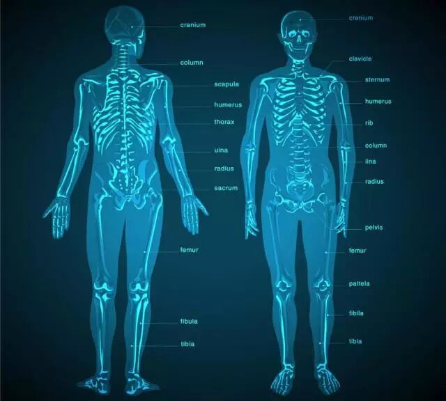 人体共有206块骨骼,分为颅骨、躯干骨和四肢骨3个大部分。