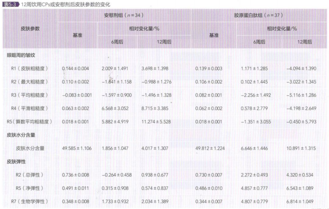 实验结果表明,服用了12周的胶原蛋白肽的受试者眼眶周围皱纹显著(P<0.05)减少。说明通过摄入胶原蛋白肽可以不断增加面部皮肤的水分含量和增强皮肤弹性,并且不会有任何副作用或不良效应。