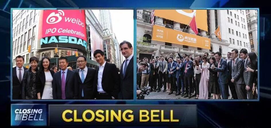 左图是微博敲钟的当天,还有姚晨和王力宏来撑台面。右边是虎牙直播在纽交所上市,没有大屏幕,只是在大楼前面挂一块广告幕布。