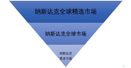 纳斯达克的三个层次其实是一个倒三角形的架构,全球精选市场的公司最多,资本市场的公司最少,而且三个层次之间可以灵活转换。原本在全球精选市场的公司,如果不能满足标准,就会被降到全球市场,而在纳斯达克资本市场的小公司,当小资本额公司发展稳定后,他们通常会提升至纳斯达克全球市场。