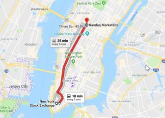 纳斯达克和纽交所其实很近,都在纽约的曼哈顿这个岛上。距离不远,纳斯达克在地铁3号线时代广场站下车,华尔街在地铁站3号线华尔街站下车,中间只有6站,18分钟即可到达。不过两者的区别是: