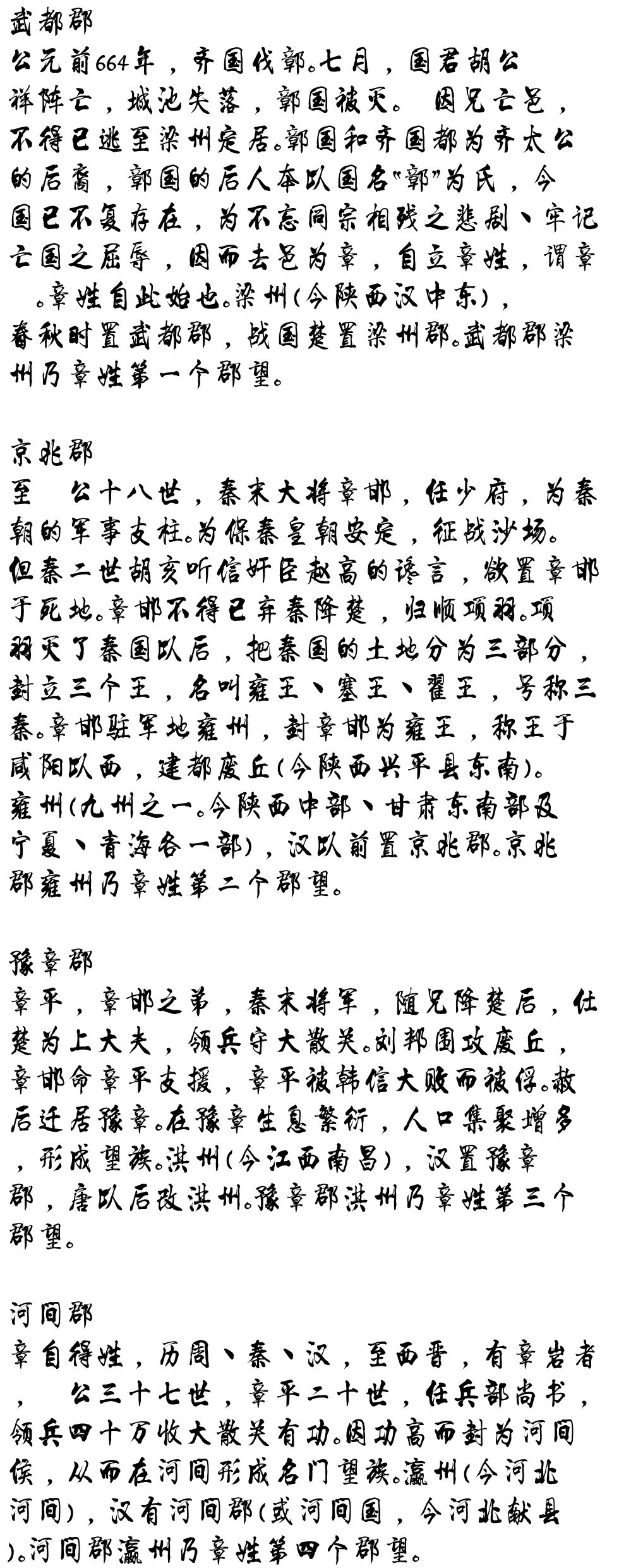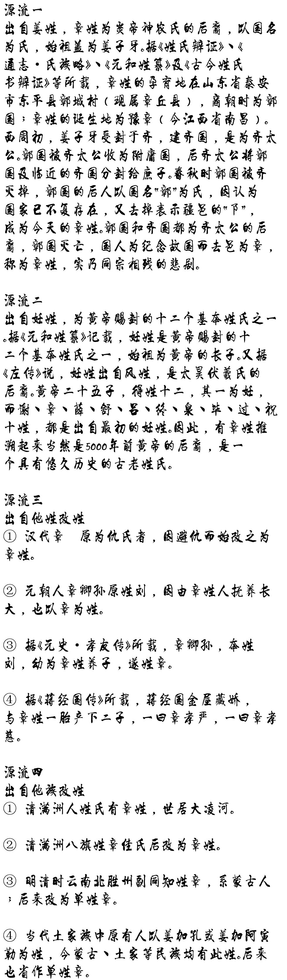 (三)姜姓吕氏伯夷南阳世系 自公元前2070年左右至公元前1042年,历一千零二十八年左右,传位代数不详。 祝融后裔伯夷在舜晚年助禹治水有功,被舜赐恢复姜姓。 在公元前2070年左右继位后封伯夷为吕侯,封地在今河南南阳一带,一说在今山东日照莒县,赐以吕氏。自夏初经商朝至西周初为姜姓吕氏并称时期。 伯夷后裔尚,字子牙,号飞熊,世称姜太公,史称齐太公。姜太公辅佐周文王、周武王伐纣立周功高。公元前1042年,周成王封姜尚(亦称吕尚)于齐,都城营丘,位于今山东临淄市。齐太公庶孙吕虎被封于齐之附庸国鄣,以国名鄣为氏,称鄣虎,史称鄣穆公。 (四)鄣氏鄣虎鄣丘世系 自公元前1042年至公元前664年,历三百七十八年,传位十三代。 鄣虎,鄣穆公被封于鄣,在今山东章丘一带,一说在今山东平县。鄣第十三代君鄣胡公即鄣祥于公元前664年被齐第十五代君齐恒公所灭,鄣国亡。鄣祥之子(一说祥之弟)鄣韅逃至梁州,即今陕西汉中定居,去鄣之部首“阝”,改鄣姓为章姓,称章韅。 (五)章氏章韅梁州世系