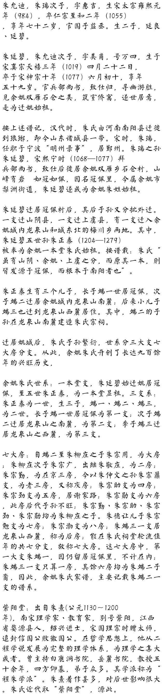 紫阳朱氏渊源系统 一世 环 字舜臣 号古僚居歙县 二世 廷雋 字文智 三世 昭元 字致尧 四世 惟甫 号文秀 五世 振 六世 绚 七世 森 八世 松 字乔年 号韦斋 九世 熹 字元晦更字仲晦号晦庵居婺沅生 生三子:塾,林,在。十世 塾 字受云 十一世 川 字伯洪生三子:椿,桐,梧 十二世 椿 生三子:宗宇、宗宙、宗联。十三世 宗宇 生五子:员一、成一、隆一、 庆一、隆三。 宋末元初成一迁居桐城,始为一世祖。 朱氏始迁桐邑成一公房统宗系记。自成一公始祖起至十二世祖期岭后,十三世起"辈份"廿字曰:士方名振广,嗣守顺其昌,立爱从亲起,推仁及万邦。以上均来自朱氏宗谱。我是紫阳朱氏,祖籍安徽桐城,立字辈,算起来应该是朱熹第二十七代孙。生为朱氏后裔,倍感荣幸。团结一致,和谐相处,创造佳绩,耀祖光宗!