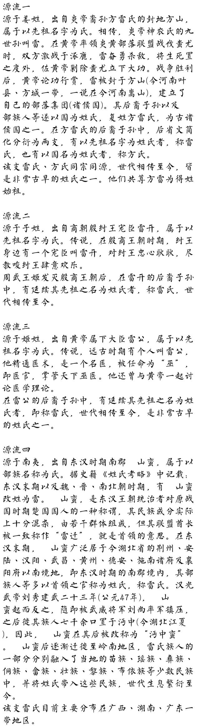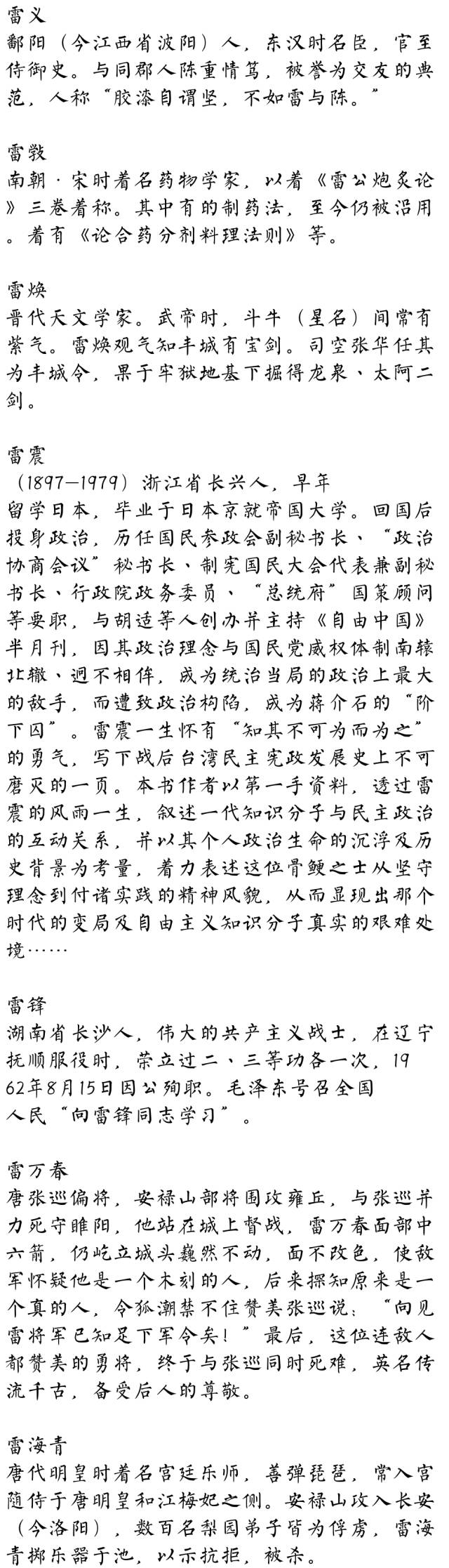 雷雳,“务”字辈,上海人,父辈“时”字,子辈“德”字辈,祖籍南宁白沙,族谱上称我支系山东青州人,祖上任青州兵马使,南宋时随杨文广入桂平侬智高叛乱而定居白沙,本人子承父业,为航空机械师。祝我雷家世世代代生生不息!