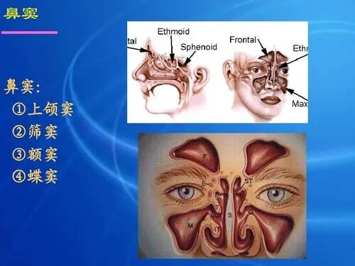 鼻子周围有四对副鼻窦,即筛窦、上颌窦、蝶窦和前颌窦 ,这些副鼻窦都有开口与鼻相通,胎儿3-4个月时,这些副鼻窦从鼻粘膜派生出来。