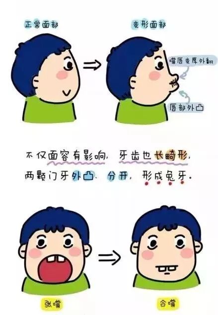 引起上颌骨变长、牙齿向外突,嘴唇变厚等所谓的“鼻病面容”