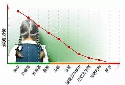 孩子一旦患有鼻炎,可导致鼻腔狭窄而影响通气,进而导致氧气吸入受阻引起血氧饱和度下降,使全身各组织器官不同程度缺氧,出现记忆力减退、智力下降、周期性头痛、头昏、视力下降、学习成绩下滑等症状表现,长期张口呼吸不仅会因为空气刺激咽腔导致咽炎,还会使孩子形成面部畸形,医学上俗称鼻炎面容。