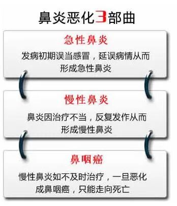 任何疾病没有得到恰当的治疗都会转变或者恶化,鼻炎、鼻窦炎也不例外,据世界卫生组织调查:全世界80%的鼻咽癌发生在中国,其中约九成是因鼻炎、鼻窦炎恶化所致,这与我国全民对健康的认知度有关,所以建议广大患者,无论什么疾病早发现、早治疗。