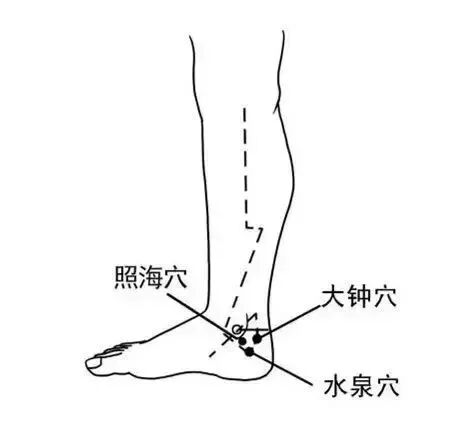 「大钟穴」在足内踝尖与跟腱连线中点下0.5寸,骨头上缘。「水泉穴」在足内踝尖与足跟尖连线的中点。「照海穴」在足内踝尖与足根尖连线上,足内踝下缘凹陷中。