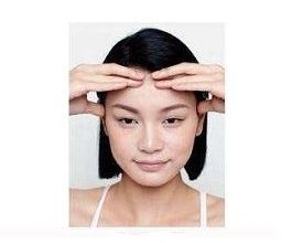 仰卧,按摩者先用两拇指指腹交错在前额横向做往返推抹,力量同上,时间1分钟;再用两拇指指腹点揉两侧太阳穴1分钟,以有酸胀感为度。
