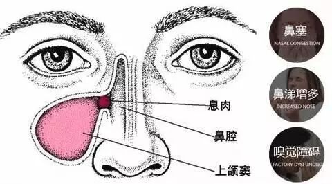 鼻息肉是赘生于鼻腔或鼻窦粘膜上突起的肿块。鼻息肉引起的鼻塞多是持续性的,单侧或者双侧都有。早期的患者的鼻内多为浆液性鼻涕,不易排出,若合并感染可有脓性分泌物。