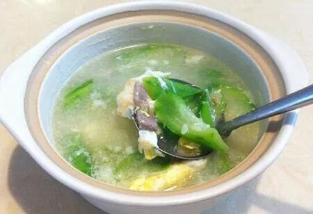 ◎ 取近根部的丝瓜藤3~5克洗净,猪瘦肉60克切块,同放锅内煮汤,至熟加少许盐调味,饮汤吃肉。