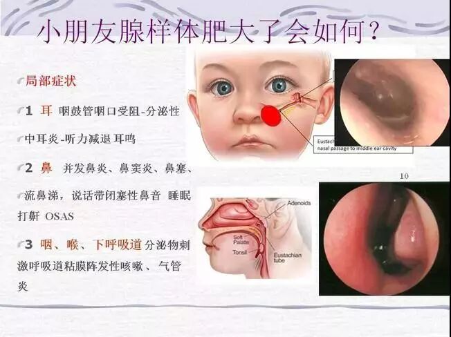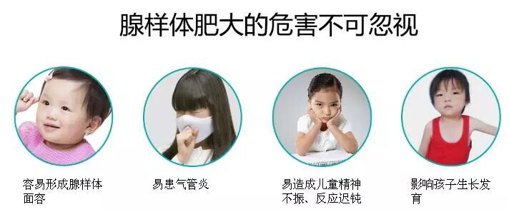 腺样体肥大高发于3-5岁,6-7岁时达到最大,正常情况下腺样体青春期后逐渐萎缩,成人后则基本消失。腺样体肥大会妨碍鼻子呼吸,并影响鼻窦的排泄,可引起耳、鼻、咽喉及下呼吸道症状,可并发中耳炎、鼻炎、鼻窦炎,分泌物长期刺激咽喉及下呼吸道,可引起相应部位的炎症,如喉炎、气管炎、支气管炎等,会影响孩子的智力及身体发育,严重者甚至出现“腺样体面容”。