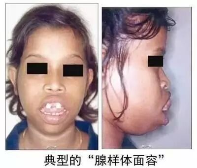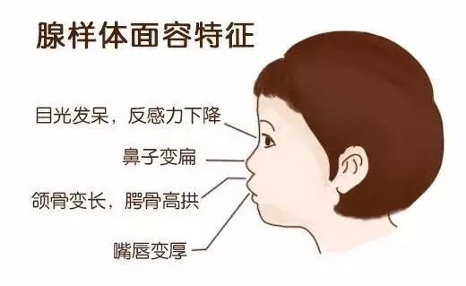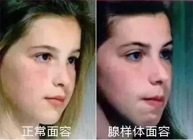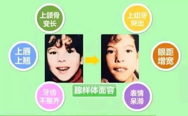 由于儿童鼻咽部比较狭小,当腺样体肥大时,由于鼻塞影响呼吸而靠嘴张口呼吸,长期用口呼吸,久而久之,面部的发育会变形,出现上唇短厚翘起、下颌骨下垂、鼻唇沟消失、硬腭高拱、牙齿排列不整齐、上切牙突出、咬合不良、鼻中隔扁曲等,面部肌肉不易活动,缺乏表情,长得很像是猪八戒或丑小鸭,医学上称之为“腺样体面容”。