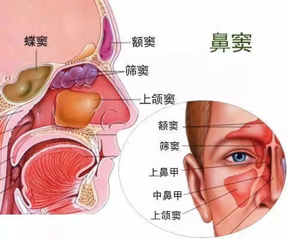 鼻是由外鼻、鼻腔和鼻窦组成,恰如一间四室一厅的房子一样,每一侧鼻腔借助深在而隐蔽的鼻窦开口分别与四对鼻窦(上颌窦、筛窦、额窦、蝶窦)相互交通。