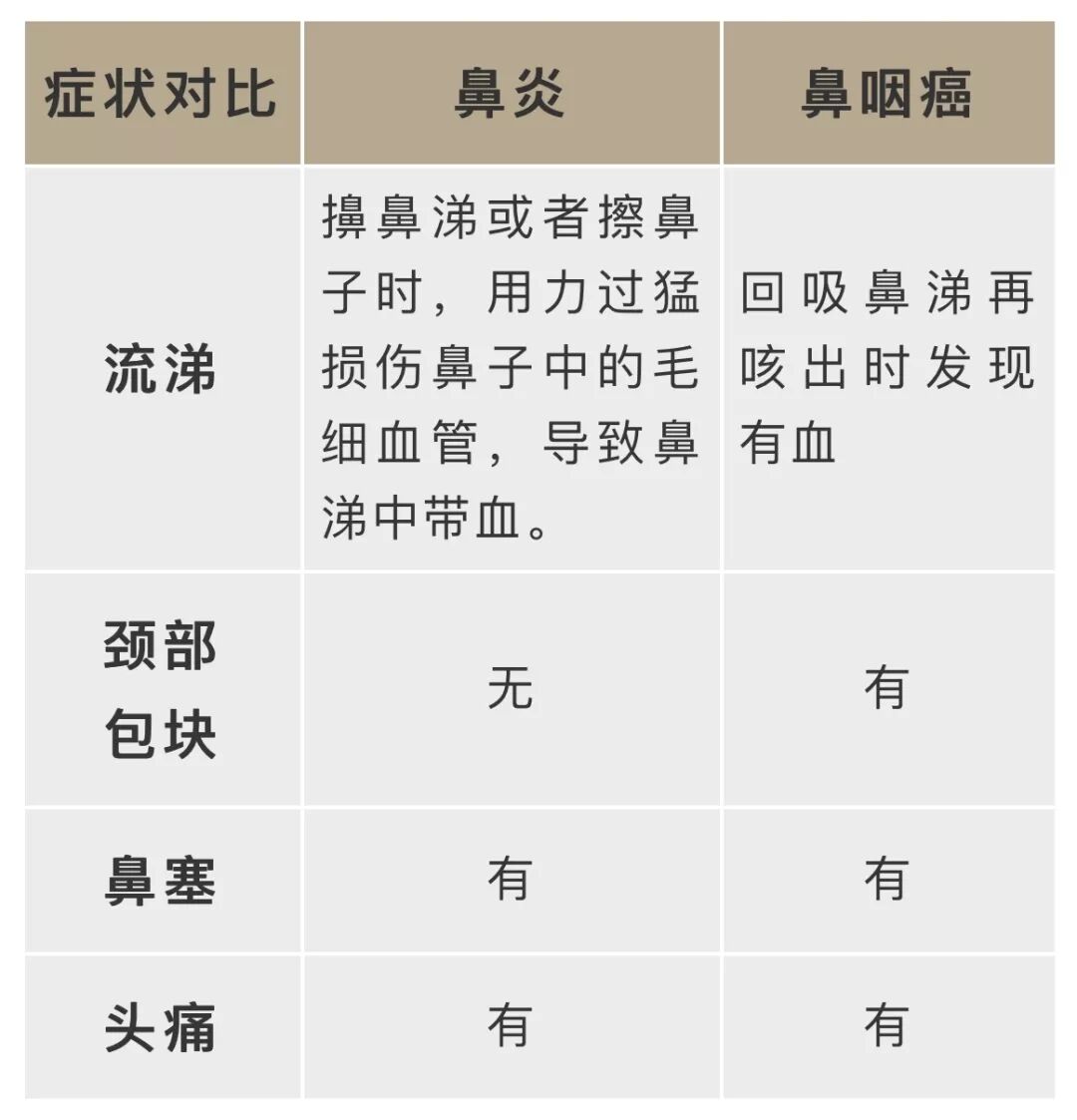 发现鼻涕带血或吸鼻后口中吐出带血鼻涕,以及不明原因的中耳积液等表现,应及时去作详细的鼻咽部的检查,以便早期发现,早期调理。