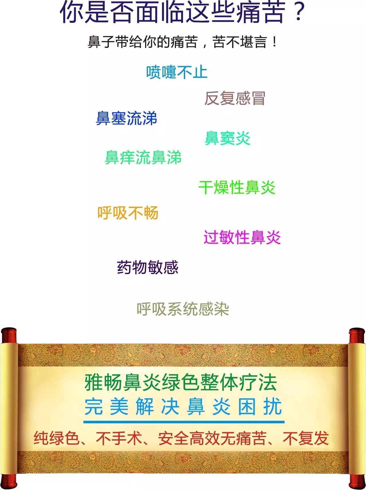 鼻窦炎、鼻涕倒流、打喷噜、头昏脑胀、喉咙干?睡觉用嘴呼吸很难受,得了鼻炎经常头晕头疼、记忆力减退,工作,学习效率明显下降,小鼻炎大问题,年年受困扰,如果你备受鼻炎的困扰,现在不用东奔西走,也不用茫然求医,更不用迟疑疗效,马上咨询我!