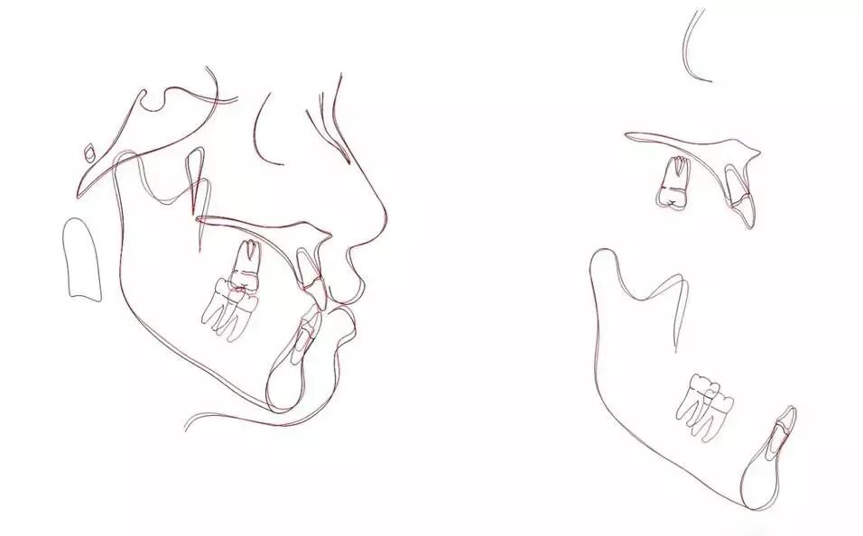 治疗后头影重叠图可见47牙大量前移关闭拔牙间隙,下颌前上旋转;下前牙少量伸长解决开合,下前牙少量内收、直立。