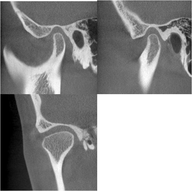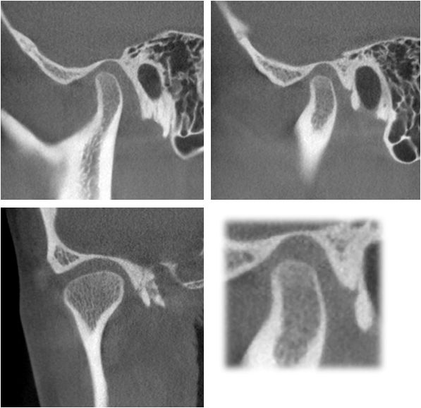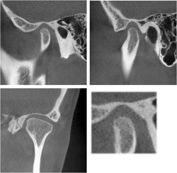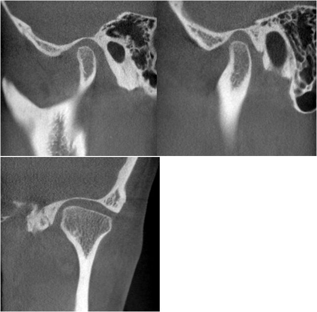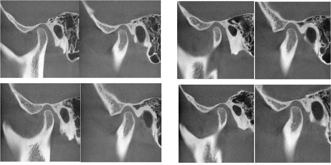 从患者双侧颞下颌关节的ct断层影像上看,右侧关节前间隙明显偏小,髁突表面骨皮质较连续但厚度较薄,右侧关节间隙较均匀,个别断面上,髁突表面的骨皮质较粗糙,不明显。左侧颞下颌关节髁突表面骨皮质模糊粗糙,厚度较薄,关节间隙较均匀。临床功能检查上,患者开口度开口型正常,双侧关节张口中期有弹响。