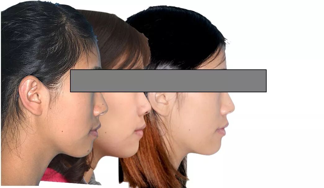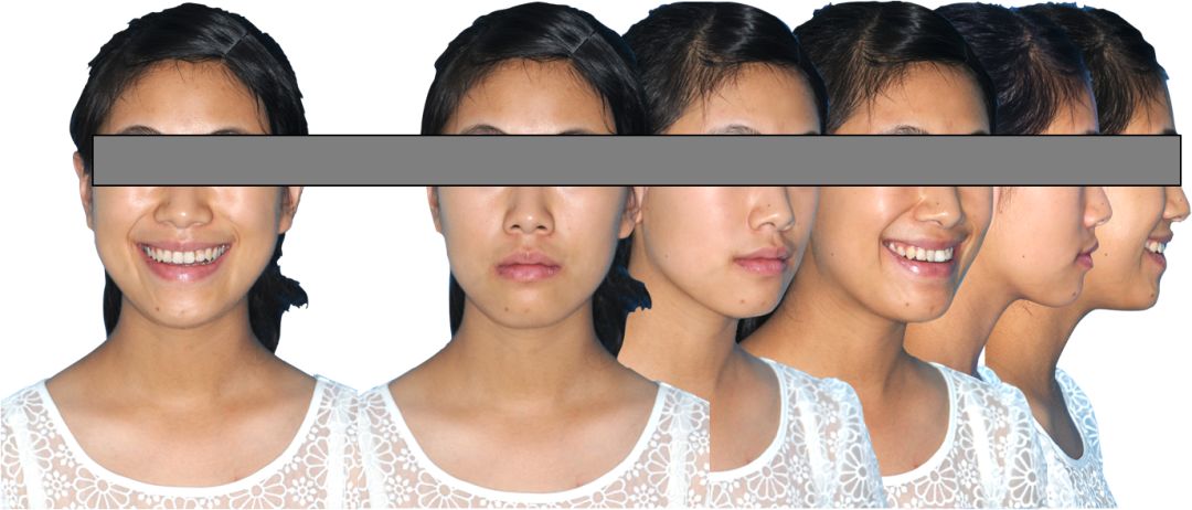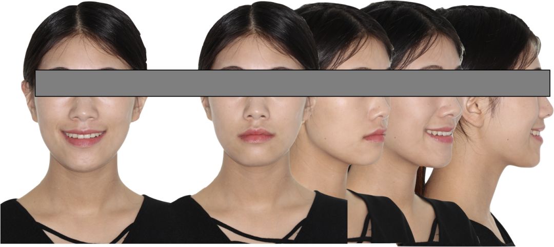 长面型,下面高偏长;面部无明显不对称;微笑时前牙暴露量正常;上颌中线与面中线基本一致;直面型;鼻唇角较小;上唇位于E线后,下唇位于E线上。