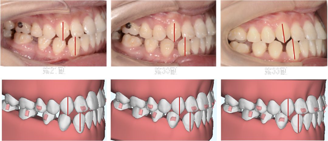 第33副,由于47牙持续的前倾,我们进行了矫治设计的反馈,患者由于干扰的去除,咬合支点的前移,出现了颌位的后退。因为这个原因,实现了比矫治设计更好的尖牙磨牙关系。所以这次我们反馈时提交的是cr位的咬合记录。