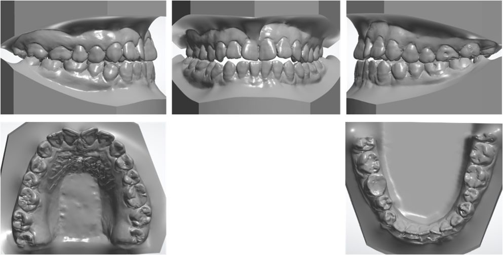 上下牙弓呈方圆形;双侧尖牙、磨牙III类关系;21牙与31牙呈切合;前牙呈现约1 mm的局部开合;下颌中线较上颌中线左偏1 mm。