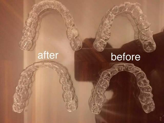 因为她的工作需求,所以自己觉得不适合戴钢丝牙套。于是专家建议她做隐形矫正,这是她矫正之前用的隐形牙套。前后对比明显能看出牙套的轮廓都变得整齐自然了。