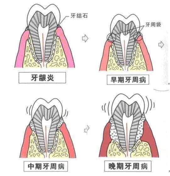 牙结石不仅刺激、压迫牙龈,而且其表面更易形成菌斑,不易去除,为细菌提供了一个破坏牙周组织的基地,引起牙龈红肿、出血和牙周韧带的破坏,并导致支持牙齿的牙槽骨被破坏和吸收,最终导致牙齿的松动和脱落。