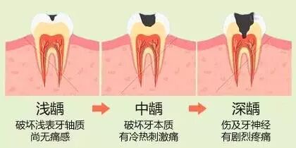 龋齿表现症状是不同的,根据龋齿破坏的程度,可分为浅龋、中龋和深龋。