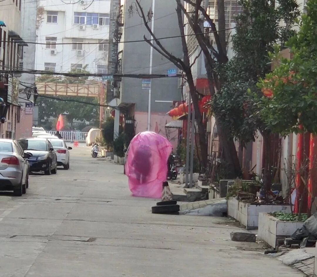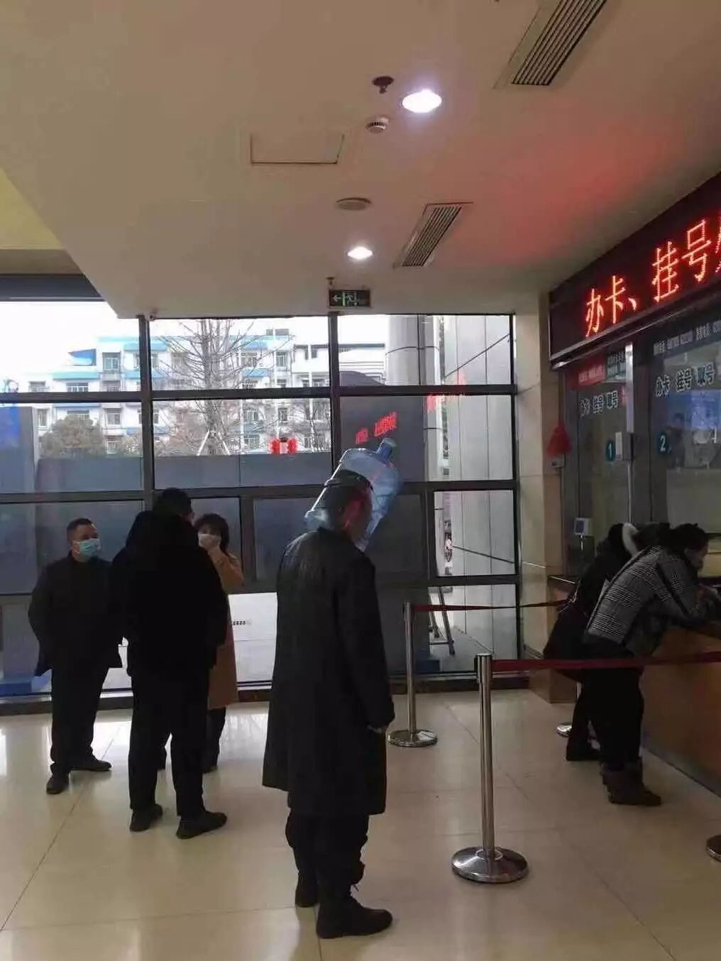 买不到口罩,就把家里的水桶剪开套头上,防止飞沫传播▽