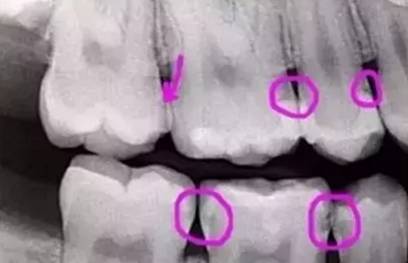 下图圈出来的地方,或多或少都有点龋齿。但是,有些你并不能看见。这些龋齿还浅不会让你有什么感觉,顶多吃东西塞牙,和冷水敏感而已。