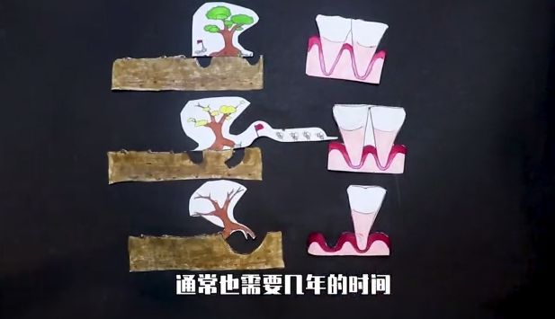 蚂蚁夜以继日地向下挖掘,直到树根周围的土壤全被蚂蚁侵占。土壤和树根就彻底分离了,大树连根拔起,这就是牙周病晚期。牙槽骨流失,牙齿脱落,只能镶牙或种牙。