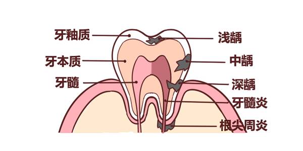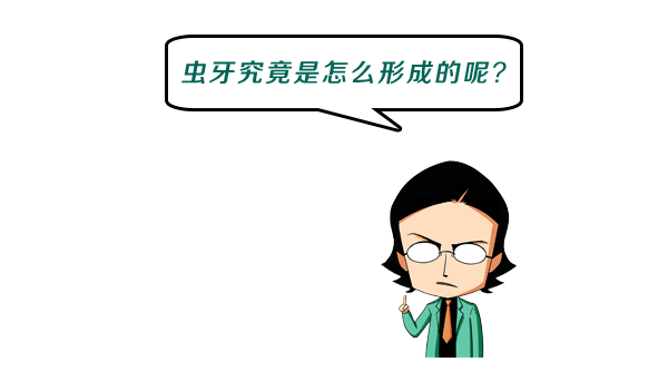 食物残渣——繁殖细菌(产生酸性物质)——破坏牙釉质(牙釉质脱落)——牙本质露出(牙本质较疏松更易破坏)——形成龋洞(由小到大)