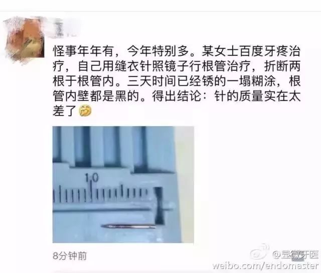 某女士在网络搜索牙疼治疗的方法,然后自己用缝衣针找镜子做根管治疗。