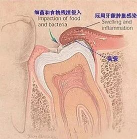 由于下颌智齿萌出最晚,下颌第二磨牙到下颌升支前缘的距离不足以容纳下颌智齿,使智齿萌出受阻,在阻生智齿牙冠的周围包盖着一层软组织龈瓣,牙冠与龈瓣之间自然形成一个间隙,像个口袋一样,特别适合藏污纳垢(食物残渣和细菌),而这里的温度和湿度都利于细菌的生长。