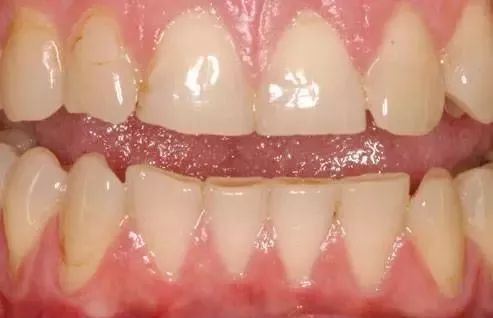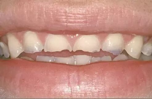 一些全身健康问题也会影响牙釉质。这张图中显示了暴食症患者的牙齿,由于常常呕吐,胃酸反流入口腔导致牙釉质被侵蚀。另外,胃食管返流综合症也会引起牙釉质的损坏。