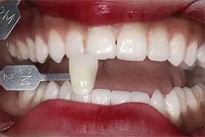 在进行贴面治疗前, 会先对患者牙齿进行比色,再选择色度适宜的瓷块,同时外染色。临床粘接时,多种不同深浅颜色的粘接剂和白色遮色剂,均可以用来辅助调整瓷贴面的颜色,以达到整体协调的美容效果。