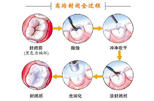 窝沟封闭又称点隙裂沟封闭,是指牙医在不损伤牙体组织的前提下,将窝沟封闭材料涂布于窝沟点隙,填满窝沟后进行固化,形成一层屏障覆盖在窝沟上,能够有效阻止细菌及食物残渣对牙体的侵蚀,从而预防蛀牙。