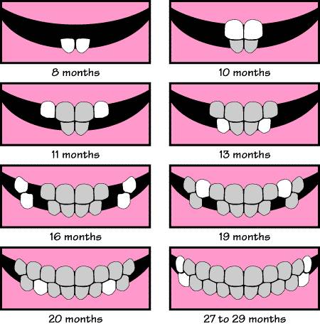 一般情况下,宝宝出生后第6~10个月就会开始萌出第一颗乳牙,从下颌的前牙开始对称性地长出,陆续的长出两边的侧前牙,尖牙和乳磨牙。通常到2岁半~3岁左右,20颗乳牙会完全出齐。
