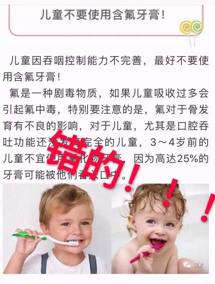 某些所谓的“专业”公号,打着氟会让孩子中毒的旗号,不倡导含氟牙膏。文章开头说过,除非孩子过量使用,比如一天内吞下一整只牙膏才会有问题。