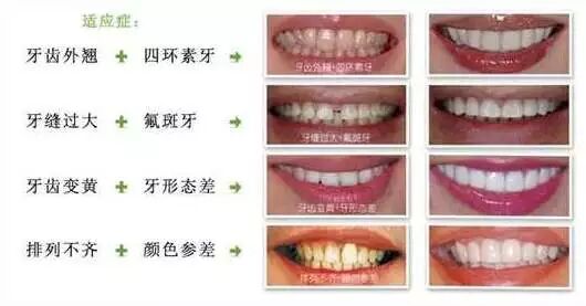 牙贴面适合:牙缝稀疏、牙齿轻度歪扭、畸形牙、形态异常牙、过小牙、变色牙、四环素牙、氟斑牙等色素牙患者。