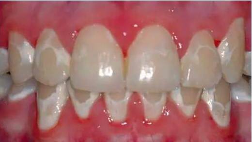 还有者,牙齿表面会出现白色的斑块,这是牙齿表面的釉质脱矿了。一旦脱矿,牙齿表面的白色斑块很难恢复,牙齿就失去了均匀一致的色泽,严重影响美观!