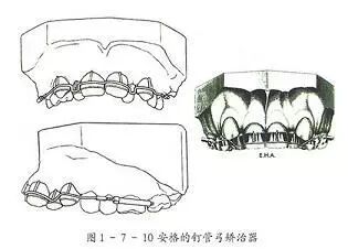 他先后于 1907、1912、 1916 年提出了E型弓、钉管弓、带状弓矫治技术。