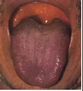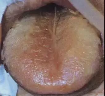 本图患者为肠梗阻,舌苔黄腻,舌面上还罩着一层黄色粘涎。是因腑气不通,湿浊之邪上泛于舌所致。